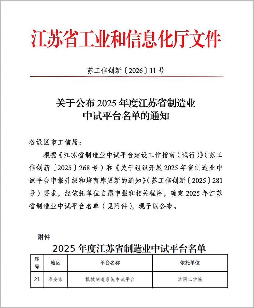 近日,江苏省工业和信息化厅公布了2025年度江苏省制造业中试平台名单,我校机械与材料工程学院申报的“机械制造系统中试平台”成功升级,为苏北唯一升级平台。该平台于2024年入选省制造业中试平台培育库,此次升级成功,标志着我校在服务先进制造领域、推动科技成果产业化方面迈出关键一步。